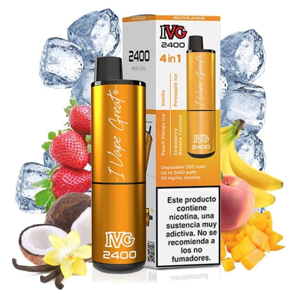 IVG 2400 es un tremendo vaper desechable que nos da la posibilidad de disfrutar de 4 sabores distintos al mismo tiempo con solo girar el vaper. Con la edición Exotic del IVG 2400 tendremos los sabores: Vanilla, Peach Mango Ice, Strawberry Banana Coconut y Pineapple Ice.