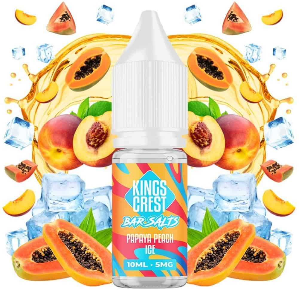 Kings Crest Salts Papaya Peach Ice es la última incorporación al catálogo de sales de nicotina de Kings Crest, la marca que más corazones ha conquistado con sus sabores para vapear. Con el Papaya Peach Ice podemos sentir el verdadero sabor de las papayas junto a melocotones carnosos, todo ello acompañado de hielo.