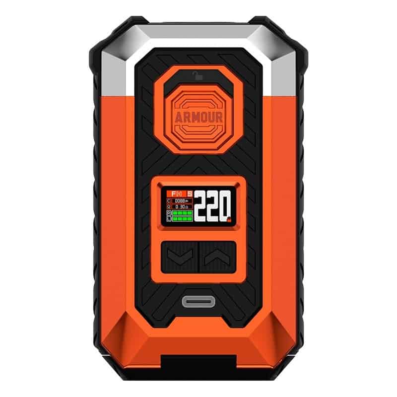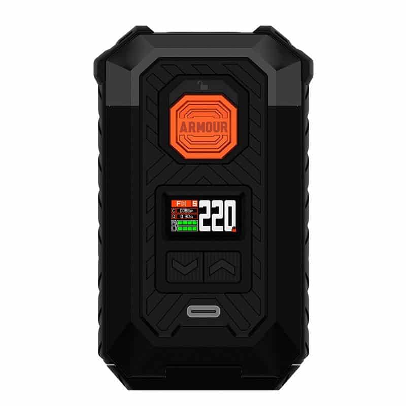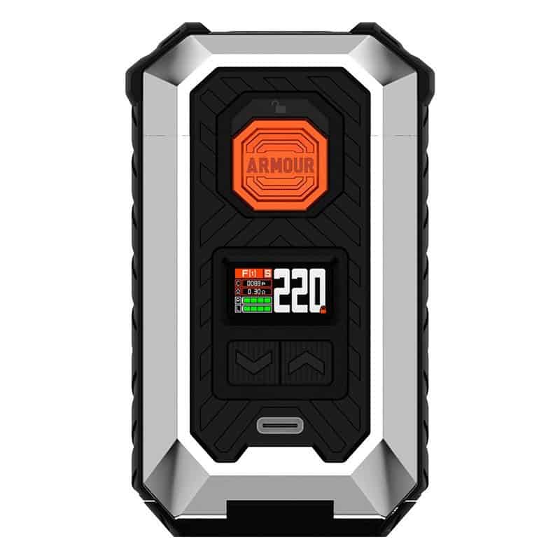 Estamos ante el Vaporesso Armour Max, un mod que va a dar mucho de lo que hablar. La potencia máxima que podemos alcanzar es de 220W, ¡una auténtica pasada! Para poder ponerlo a funcionar necesitaremos dos baterías externas 18650 o 21700 (no incluidas). En la parte frontal encontramos un puerto USB Tipo C por el que podrás cargar las baterías de manera rápida aunque, desde Bazar del Vapeo siempre recomendamos utilizar un cargador de baterías externo para poder cuidar mejor la vida del Mod y de las propias baterías.